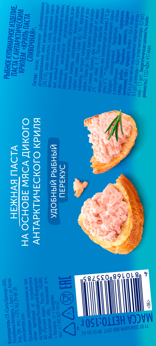 Нежная крем-паста на основе мяса антарктического криля. Мясо криля содержит витамины, жирные кислоты Омега-3, ценный рыбный белок. Имеет сладко-сливочный вкус. Без усилителей вкуса и консервантов.