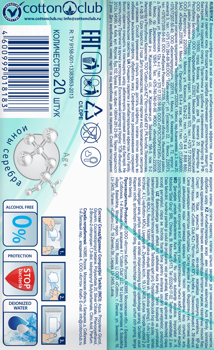 Влажные салфетки Аура антибактериальные 20 шт
