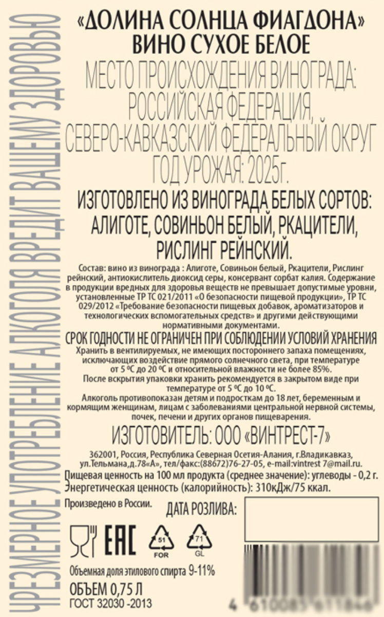 Вино Долина солнца Фиагдона белое сухое 0,75 л
