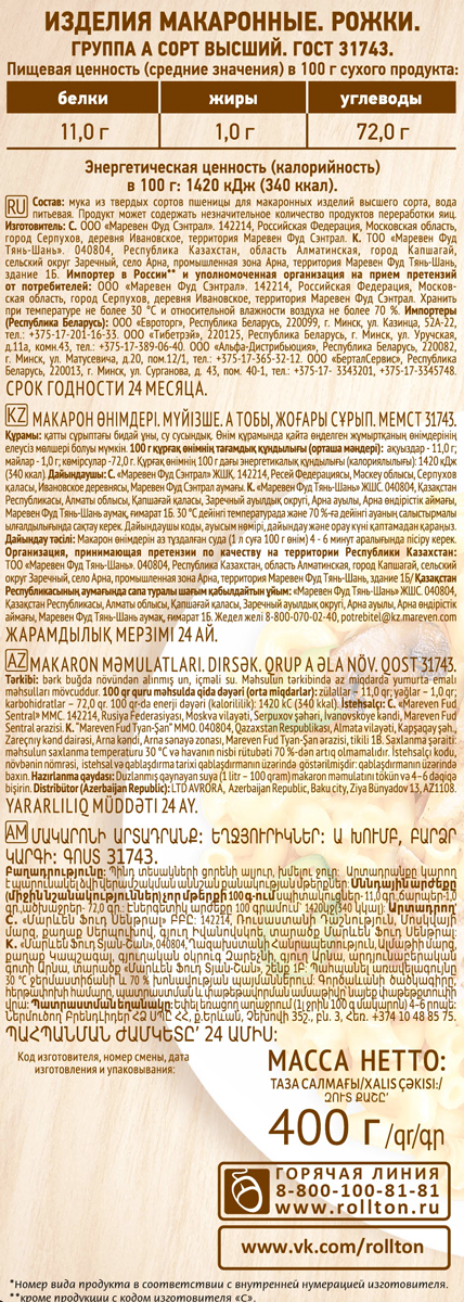 Макаронные изделия Рожки Роллтон