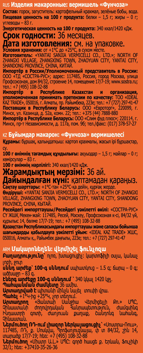 Фунчоза — традиционный продукт и необходимая составляющая многих блюд азиатской кухни. Часто эту тонкую лапшу также называют стеклянной из-за характерной прозрачности, которую она приобретает после приготовления. Бобовая вермишель прекрасно сочетается с овощами и мясом в горячих блюдах и супах, ее подают на гарнир и добавляют в салаты. Самым популярным из них является знаменитый салат по-корейски «Фунчоза», полюбившийся многим российским хозяйкам. Продукт производится из качественного сырья по традиционной рецептуре.