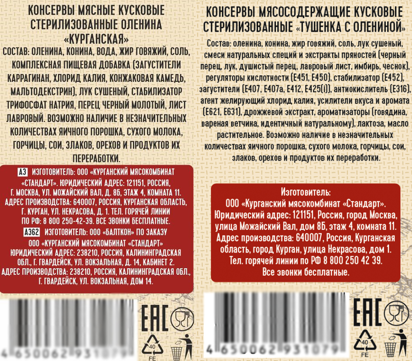 Неплохое тушёное мясо по вкусовым характеристикам. И всё было бы прекрасно, если бы не одно "но" - состав. На втором месте в ингредиентах - вода. Затем, чтобы не было мучительно больно от гневных криков покупателей туда пихают влагосвязывающую пищевую добавку, состоящую из мальтодекстрина, о вреде этого крахмального продукта не сложно почитать в интернете, хлорид калия, от которого может быть даже польза, и проч. Делается это для удешевления производства, но питательной ценности не несёт никакой. Это не значит, что Курганский комбинат выпускает плохую продукцию. Есть у них тушёная оленина высокого качества в серии Exclusive standard, без воды, и прочей посторонней пакости. Было бы неплохо, если бы она появилась в продаже и в "Красном и белом". Да, стоила бы она значительно дороже, но вот её бы я точно купил сразу банок 40 впрок.