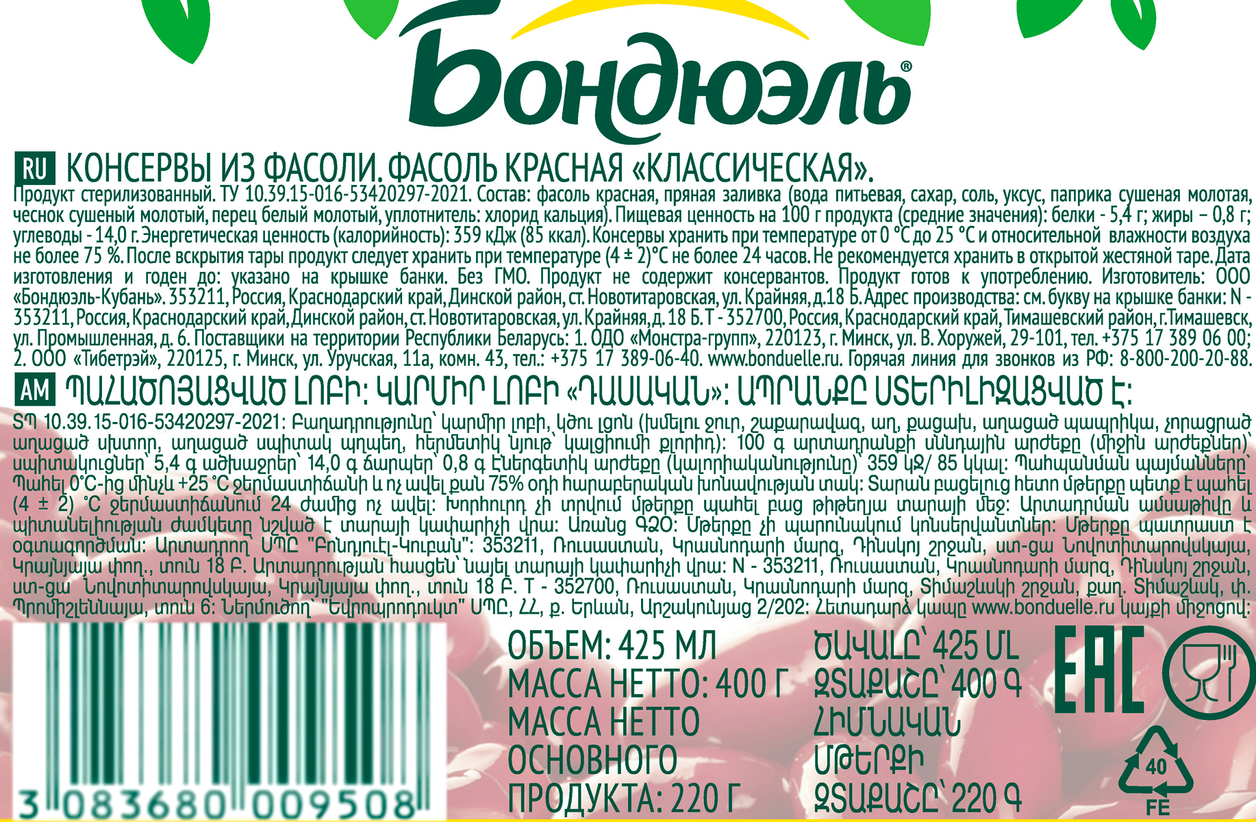 Фасоль красная Bonduelle — это отборные бобы в натуральной заливке для ваших любимых блюд: идеально подходит для салата, супа, гарнира. Добавьте растительный белок и клетчатку в свой рацион. Без консервантов.