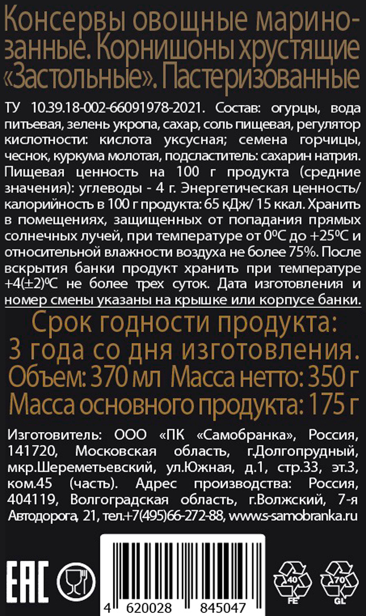 Корнишоны Скатерть-Самобранка Застольные маринованные 350 г