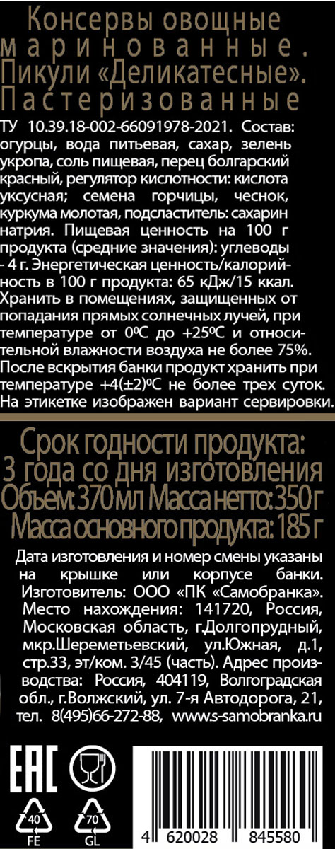 Пикули маринованные Деликатесные от Скатерть-Самобранки - это маленькие аппетитные корнишоны. Эти отборные хрустящие огурчики и хорошо подобранный букет из зелени и специй украсят любое застолье.