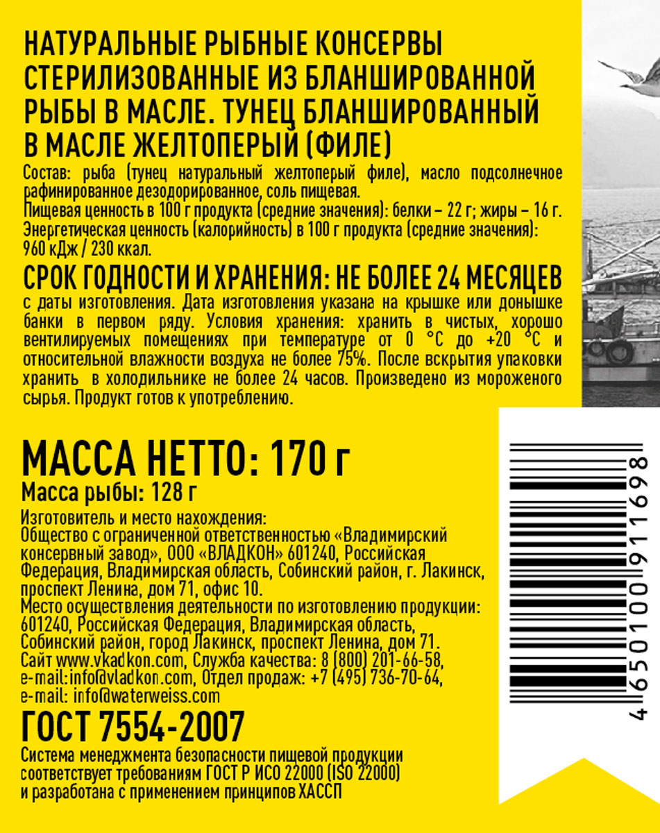Тунец Владкон бланшированный в масле филе 170 г