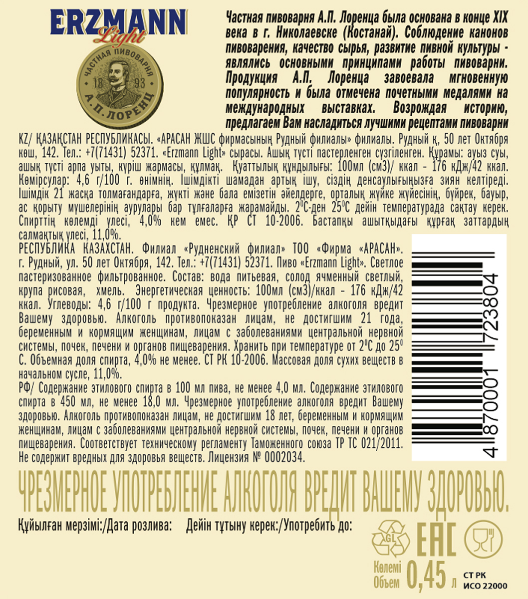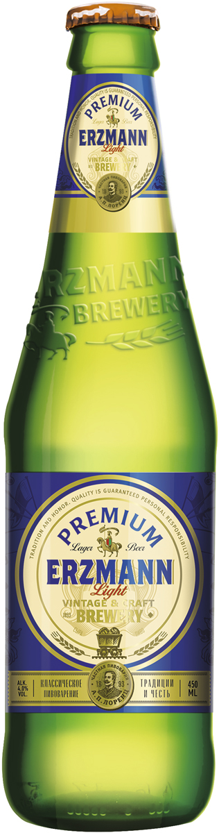 Erzmann Light пропитано ароматом рыцарского благородства. Классический светлый лагер. Легкое пиво с мягким вкусом и тонким хмельным ароматом. Пиво проходит «мягкую» фильтрацию с минимальным количеством дрожжей, что придает напитку прозрачный, золотистый цвет и легкий, мягкий вкус.