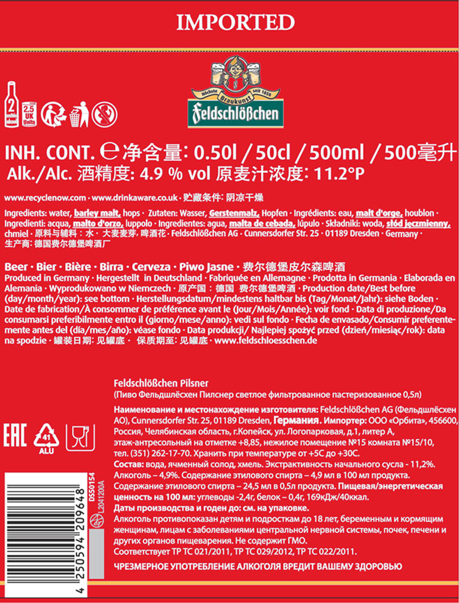 Светлое пиво «Фельдшлёсхен» сварено в соответствии с немецким «Законом о чистоте пива». Имеет красивый светло-золотистый цвет. Отличается свежим пряным вкусом с хмелевыми нотками. Отлично сочетается с содовой. Также хорошо дополнит рыбные блюда и снеки, морепродукты, овощи, мясо и барбекю.