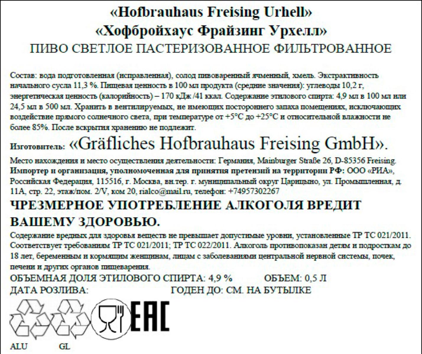 Пиво Хофбройхаус Фрайзинг Урхелл светлое фильтрованное пастеризованное ст