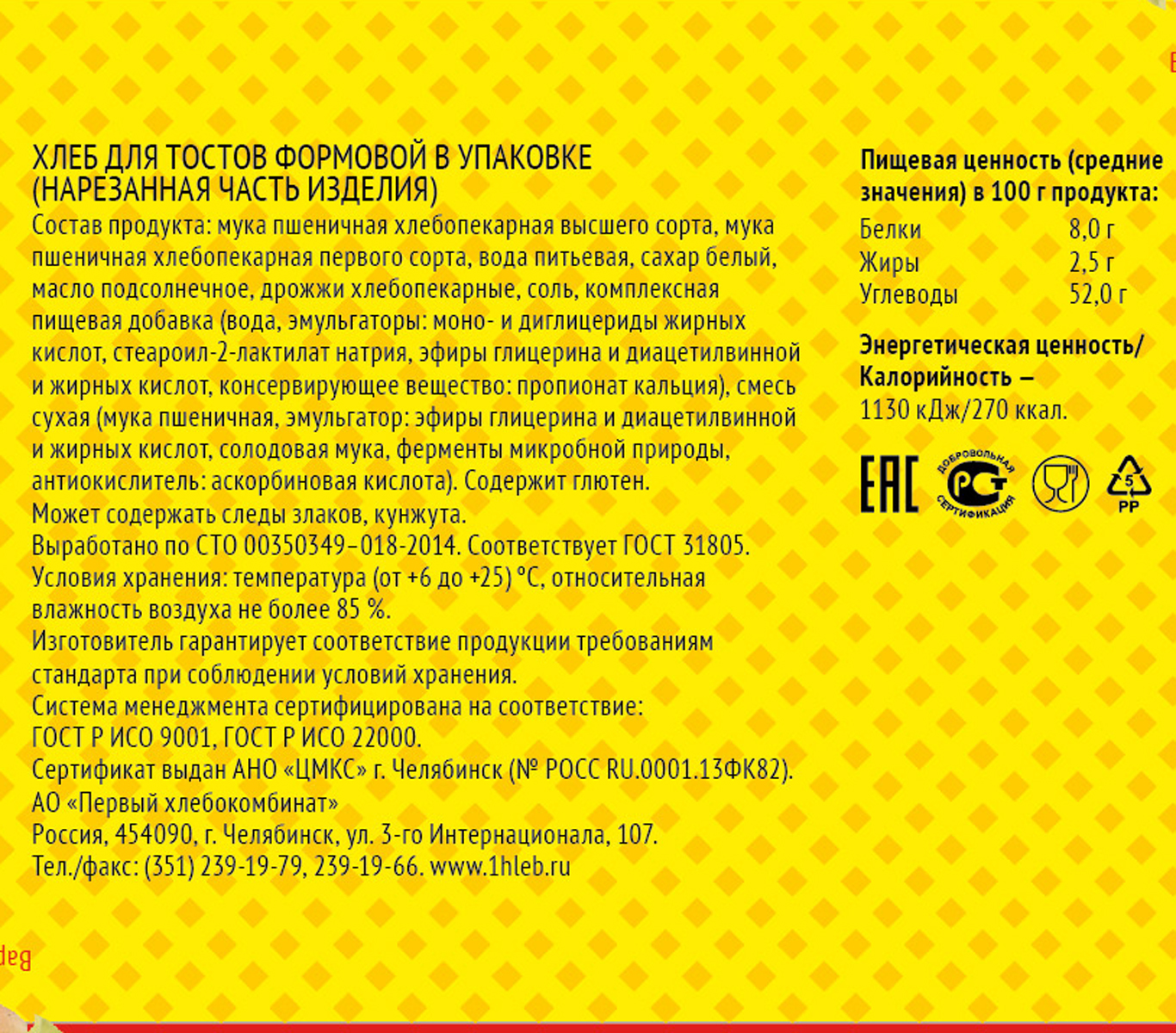 Хлеб для тостов нарезка Первый ХК