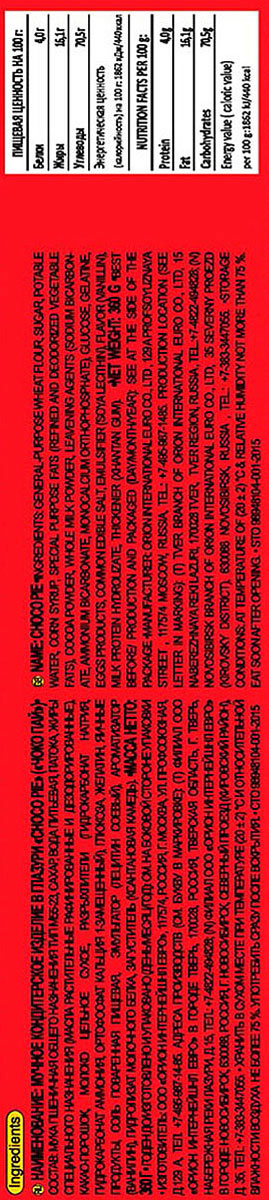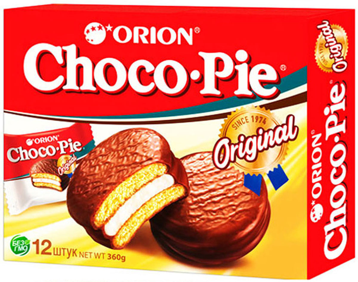 Choco-Pie — знакомый с детства вкус нежного бисквита, покрытого шоколадом, с уникальной начинкой Marshmallow. Запатентованная технология производства и индивидуальная упаковка позволяет Choco-Pie оставаться мягким и свежим надолго. Знак Original на упаковке — гарантия непревзойденного качества Orion Choco Pie! Без консервантов, искусственных красителей и глутамат натрия. Богат витаминами В2, В6, Е, кальцием, железом и йодом. Входит в состав сбалансированных завтраков, разработанных совместно с НИИ питания РАМН. Есть также со вкусом черной смородины и манго!