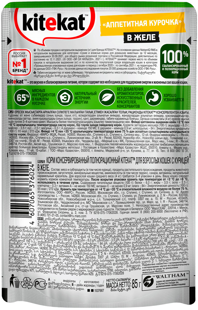 Кажется это именно то, что хотел попробовать ваш любимец! Всё самое вкусное для вашего пушистого друга! Kitekat® «с курицей в желе» – это порция сочных кусочков с курицей, приготовленных по особому рецепту. В его основе – формула сбалансированного питания, которая содержит белки, минералы, витамины, таурин и животные жиры. Kitekat – это идеальный источник жизненных сил для кошки.