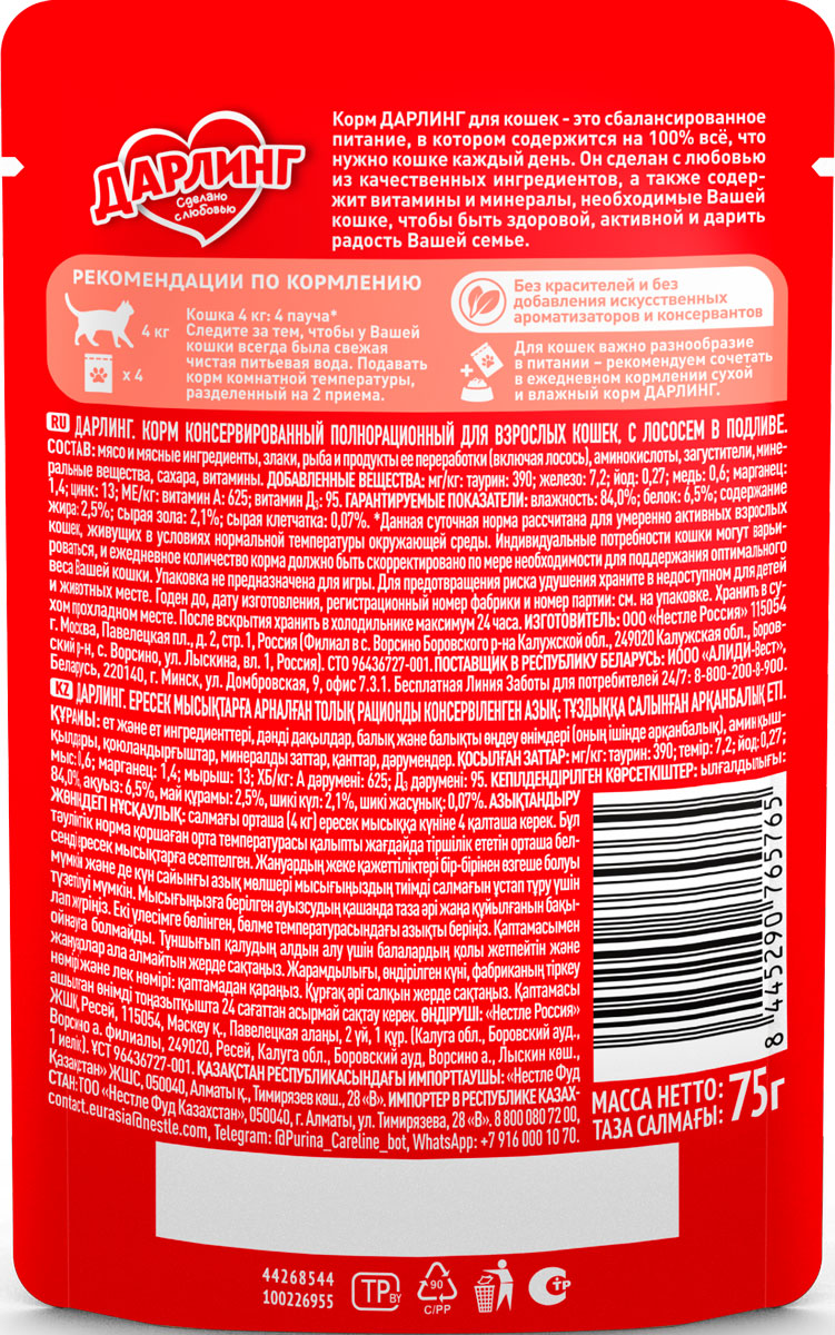 Корм «Дарлинг» для кошек — это сбалансированное питание, в котором содержится на 100% всё, что нужно кошке каждый день. Он сделан с любовью, из качественных ингредиентов, а также содержит витамины и минералы, необходимые вашей кошке, чтобы быть здоровой, активной и дарить радость вашей семье.