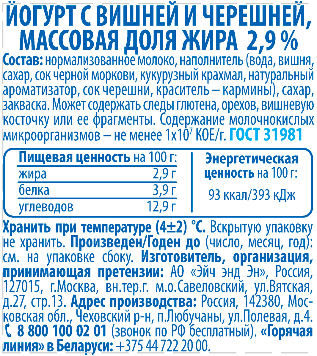 Йогурт Простоквашино вишня черешня 2,9%