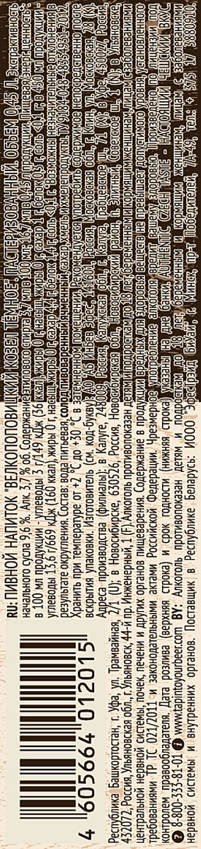 Velkopopovický Kozel Темное – пиво, изготавливаемое по специальному рецепту из особой смеси темных сортов солода, благодаря чему его пена натурального темного цвета. У этого пива прекрасный мягкий вкус и тонкий аромат, а карамельный солод в его составе придает напитку приятное послевкусие.