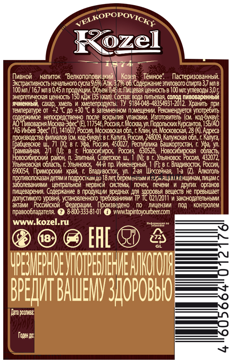 Пиво Velkopopovicky Kozel темное производится по оригинальной рецептуре из специальной смеси темного солода, чистой воды из собственных скважин около пивоваренного завода и отборного лучшего хмеля. Карамелизованный солод придает пиву уникальный коричнево-рубиновый цвет и сладкий аромат и вкус, которые ценят и уважают во всем мире.