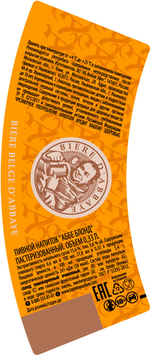 Напиток пивной Аббе Блонд пастеризованный ст 0,33 л