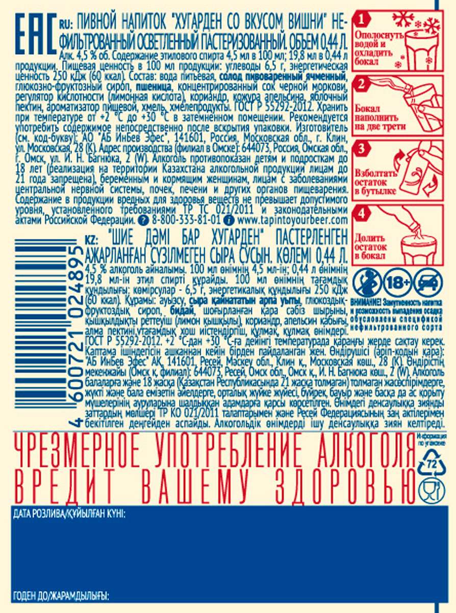 Hoegaarden — эталон сорта «бельгийский бланш». Легендарное пшеничное пиво, сваренное с добавлением цедры апельсина и кориандра. Теперь со вкусом вишни – невероятно вкусная новинка! Прекрасно сочетается с рыбой, суши, морепродуктами (особенно с креветками, мидиями), фруктовым салатом или блюдами, подающимися с цитрусовыми, голубыми сырами.