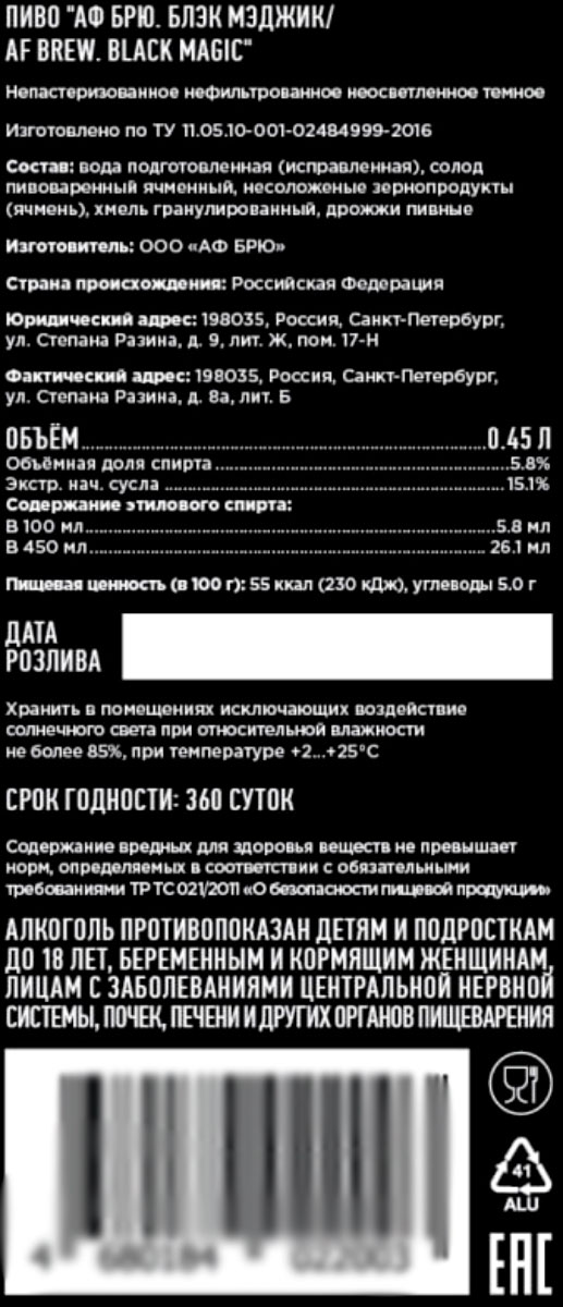 Пиво АФ Брю Блэк Мэджик темное нефильтрованное непастеризованное ж/б 0,45 л