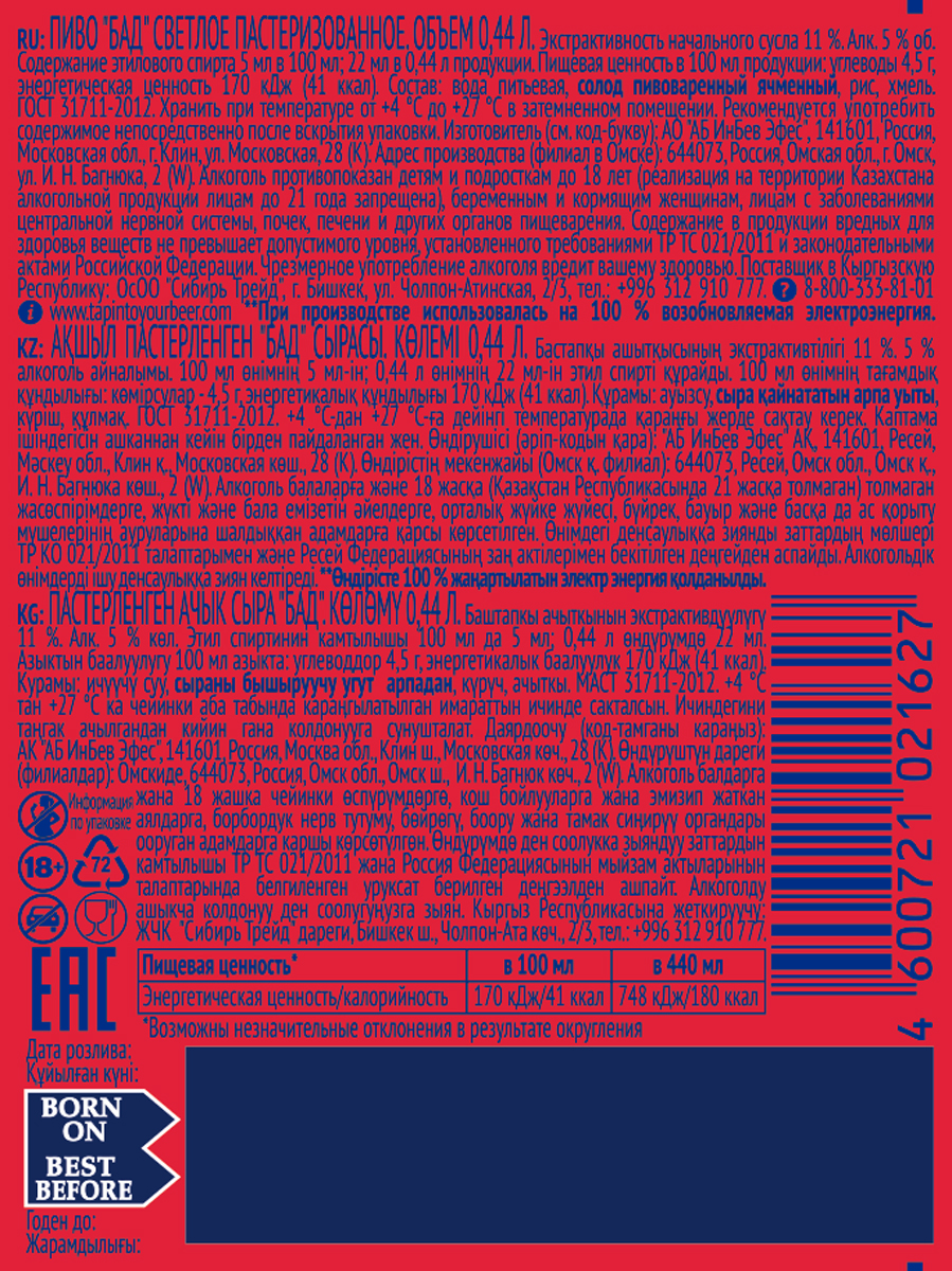 Пиво BUD продается в 80 странах мира. Бренд BUD относится к премиальному классу пива и использование уникальных технологий в процессе производства пива BUD позволяет получить превосходное сочетание вкуса и свежести.