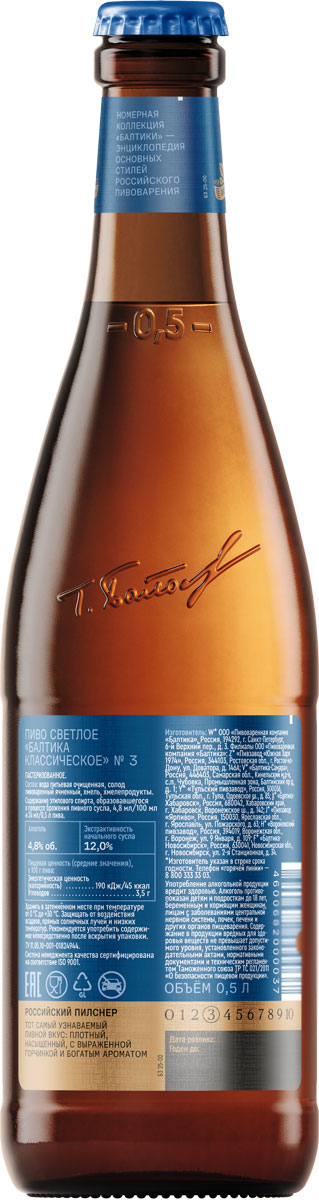 Пиво Балтика Классическое №3 светлое пастеризованное ст 0,5 л