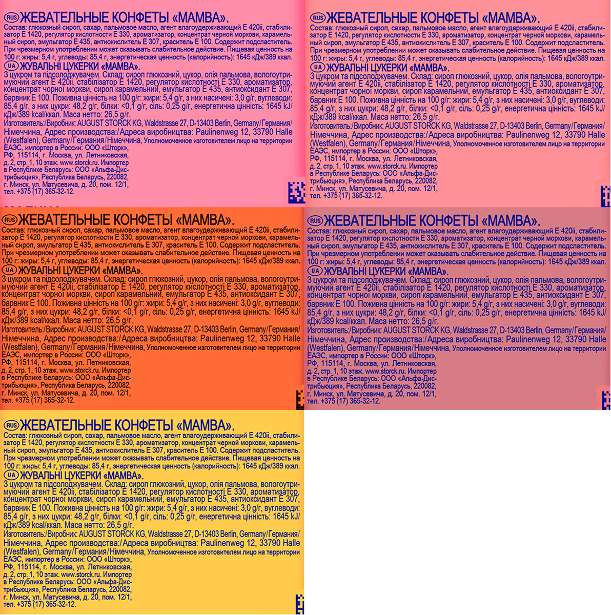 «Мамба» — это фруктовые жевательные конфеты. Есть 5 сочных вкусов: клубника, малина, вишня, апельсин и кола. Попробуйте скорее, ведь «Мамбу» любят все!