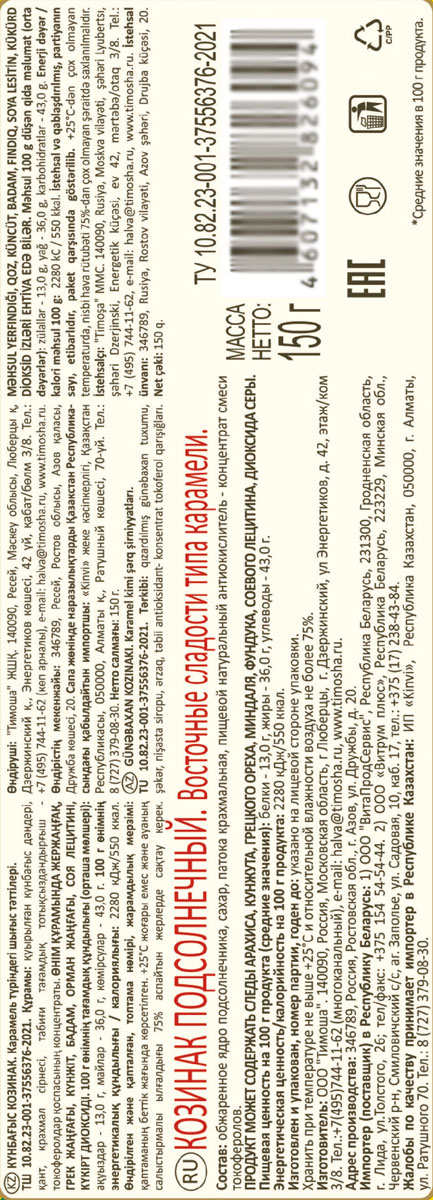 Восточные сладости из семян подсолнечника, залитых сахарной патокой. Благодаря своему составу козинаки — это очень питательное угощение. Семена подсолнечника содержат много веществ, которые заряжают энергией и надолго утоляют чувство голода. Для тех, кто любит сытно и сладко похрустеть!