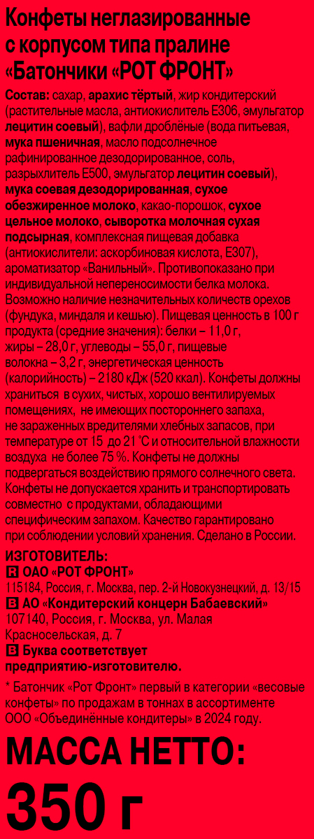 Классические неглазированные конфеты «Рот Фронт» — широко известный батончик из пралине с добавлением сухого молока, какао и хрустящих крошек вафель. Никакой глазури, только нежный вкус традиционного арахисового батончика!
