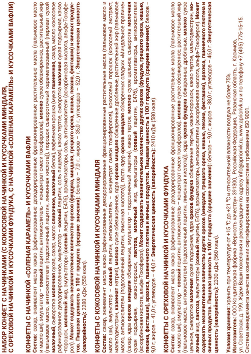 Набор конфет с изысканными начинками станет идеальным подарком для близких и коллег или порадует вас в минуты отдыха! Конфеты с кокосовой начинкой и кусочками миндаля: нежнейшая кокосовая начинка сливается с кусочками миндаля, создавая гармонию вкуса. Конфеты с ореховой начинкой и кусочками фундука: насыщенная и мягкая ореховая начинка дополнена кусочками фундука. Конфеты с начинкой «Солёная карамель» и кусочками вафли: идеальное сочетание солёного и сладкого. Мягкий вкус карамели и лёгкая солоноватая нотка, дополненные кусочками вафли. Откройте для себя мир сладких удовольствий!