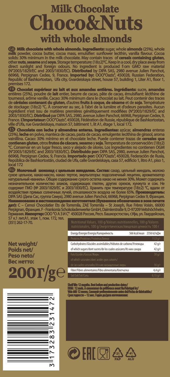 Choco&Nuts молочный с цельным миндалем Чоко Натс