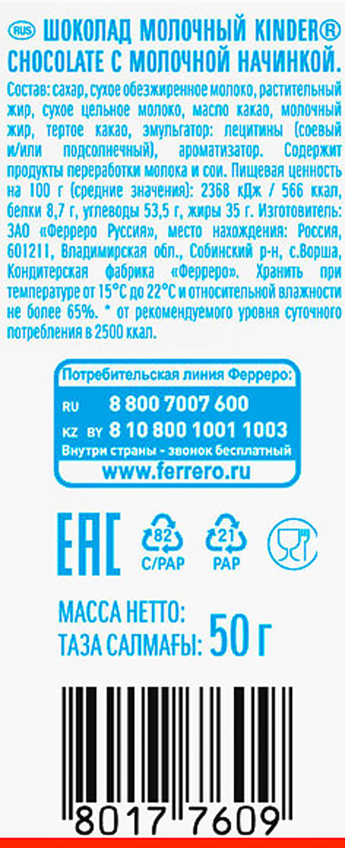 Шоколад Киндер с молочной начинкой 50 г