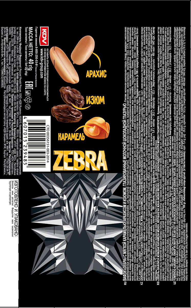 Zeбра — это многослойная вафля с изюмом и арахисом в мягкой карамели, покрытая молочной шоколадной глазурью. Вам точно понравится чередование светлой начинки с ароматом ванили и темной с натуральным какао. И все это в роскошной компании хрустящего арахиса, изюма, слоя мягкой карамели и нежнейшей шоколадной глазури. Просто невозможно оторваться! Батончик в удобной упаковке всегда можно взять с собой на работу или дать ребенку в школу.