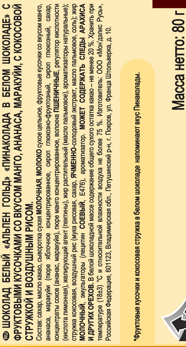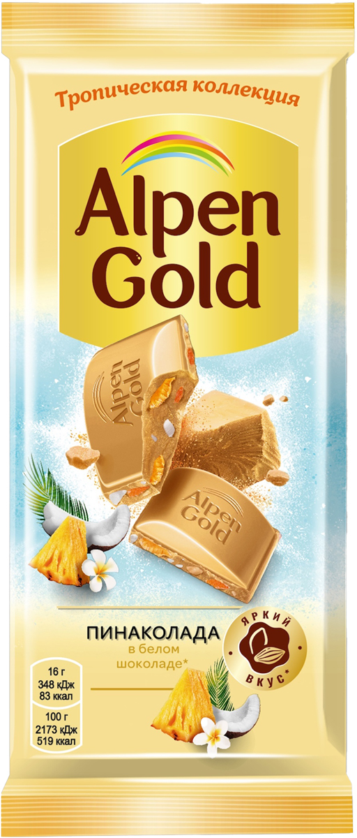 Alpen Gold «Пинаколада в белом шоколаде» — это невероятный микс ярких вкусов знаменитого коктейля из тропических фруктов, нежного шоколада и ароматного кокоса, дополненный легкой текстурой воздушного риса. Производится по высоким стандартам качества из натуральных какао-продуктов, заряжает ярким настроением и приглашает к вкусным открытиям. Плитка шоколада Alpen Gold — это сладкое удовольствие в каждом кусочке, которым хочется поделиться с друзьями и близкими людьми. А еще — это простой способ сделать свой день ярче и веселее!