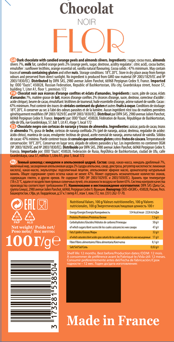 Шоколад Флор темный с миндалем и апельсиновой цедрой