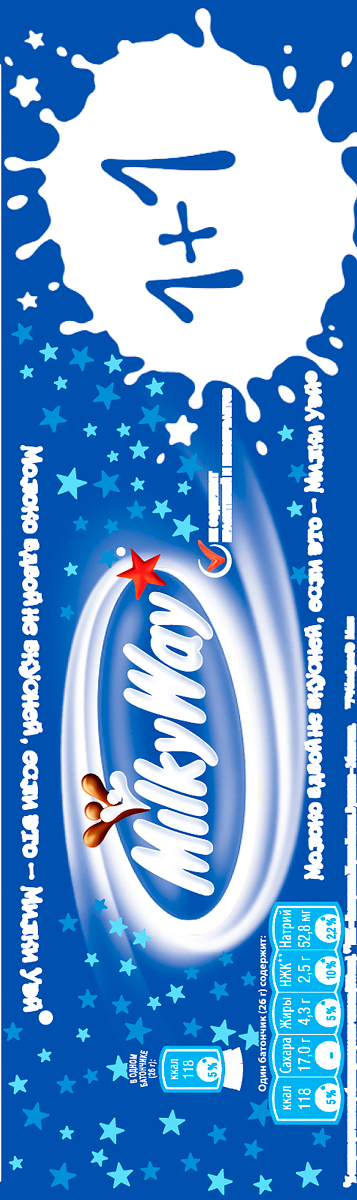 Легкое суфле, покрытое молочным шоколадом, обеспечивает мягкую текстуру и молочный вкус — Milky Way 1+1 можно разделить с друзьями, родными или коллегами. Делитесь радостью с близкими людьми. Неважно, есть ли у вас несколько свободных минут перед тем, как забрать детей, или вы делаете перерыв в учебе или работе, иногда вам просто хочется чего-то легкого, чтобы поднять настроение после обеда.