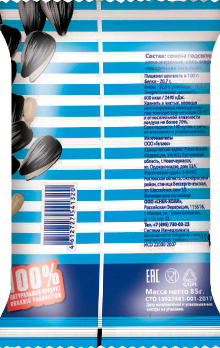 Семечки «Вкус моря» собираются на полях Краснодарского Края. Обжариваются с морской солью. Упаковываются в трехслойную высоко барьерную пленку, в азотную среду, для улучшения сохранности вкусовых качеств продукта. Так вкусно, что невозможно остановиться!