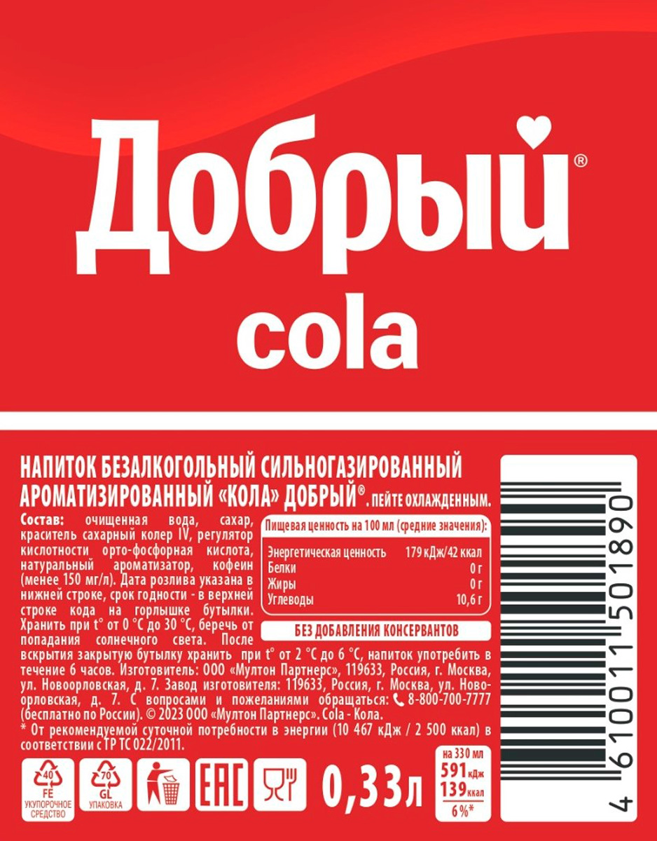 Новый сильногазированный напиток Добрый® «Кола» — это яркий и освежающий заряд хорошего настроения, которым так хочется делиться с тем, кто рядом. Пейте охлажденным!