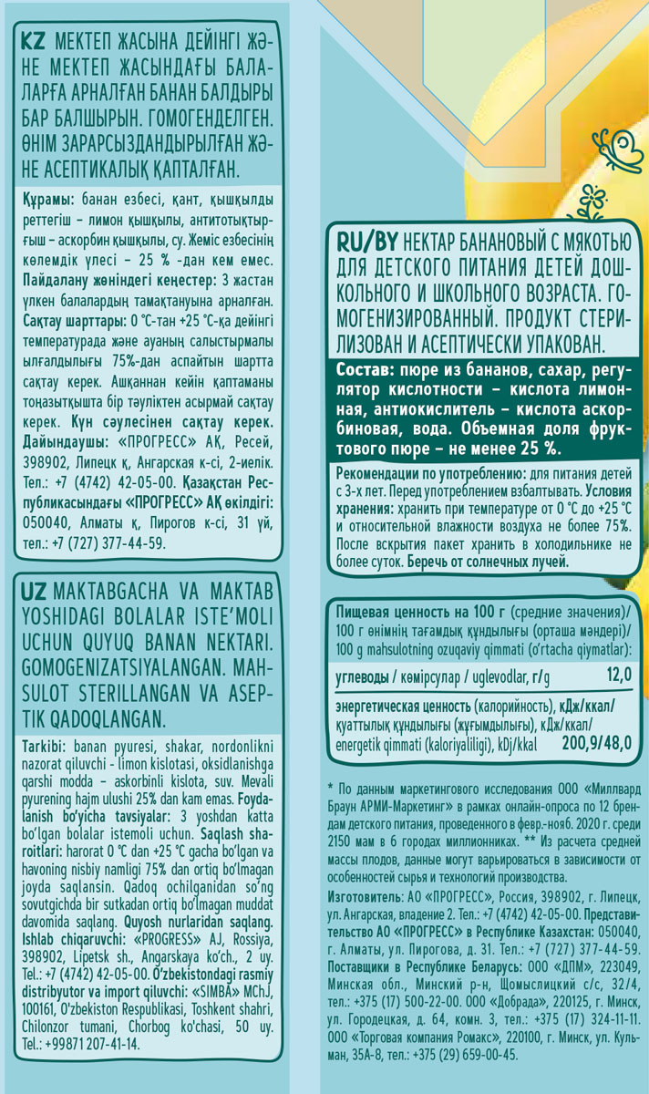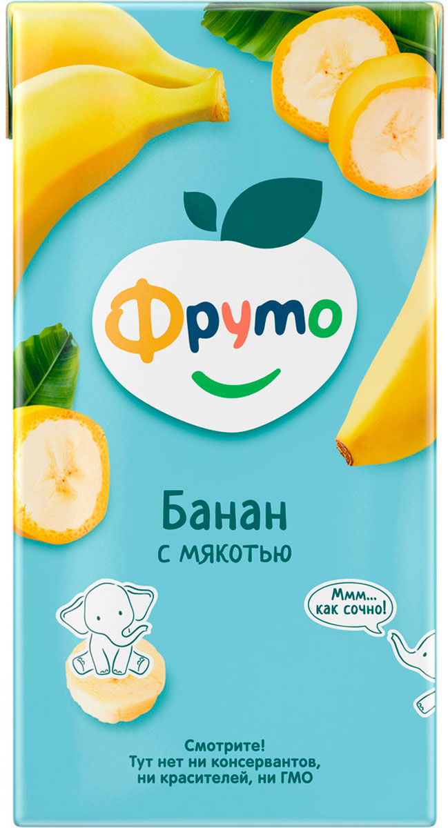Банановый нектар с мякотью «Фруто Няня» рекомендуется для детей от 6 месяцев. Гомогенизированный. С добавлением сахара. Банан — источник огромного количества витаминов и микроэлементов. Кроме того, в бананах содержится эфедрин, который улучшает деятельность центральной нервной системы. Калий, содержащийся в банане, в первую очередь, помогает формированию мышечной системы, сердца, печени и мозга.