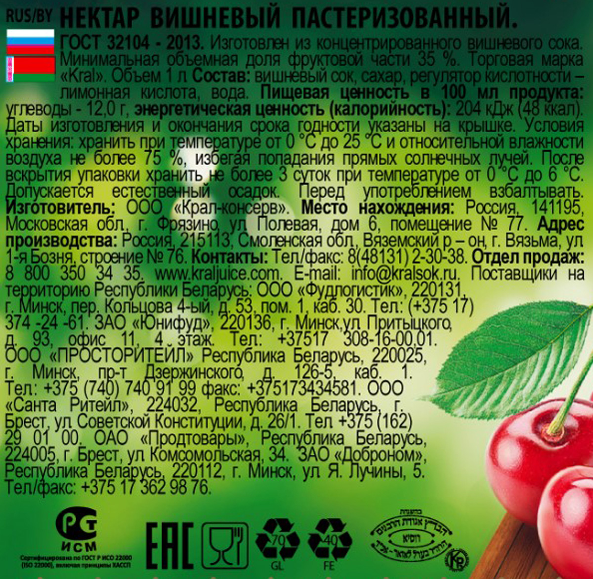 по сравнению с другими соками Крал, именно этот на слабую четверочку. сильно разбавлен водой, немного усилителя вкуса и запаха не помешает. на вкус как сильно разбавленный вишневый компот, насыщенности нет вообще. понимаю что все натурально, но хочется органолептических ощущений которых увы нет.