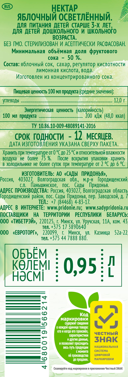 Нектар «Сады Придонья» Зеленое яблоко производится из зеленых сортов донских яблок. Северный Синап, Избранница, Курский Золотой — сок из этих яблок обладает самыми низкими аллергенными свойствами, поэтому хорошо переносится, подходит всем без исключения и имеет приятный освежающий вкус.