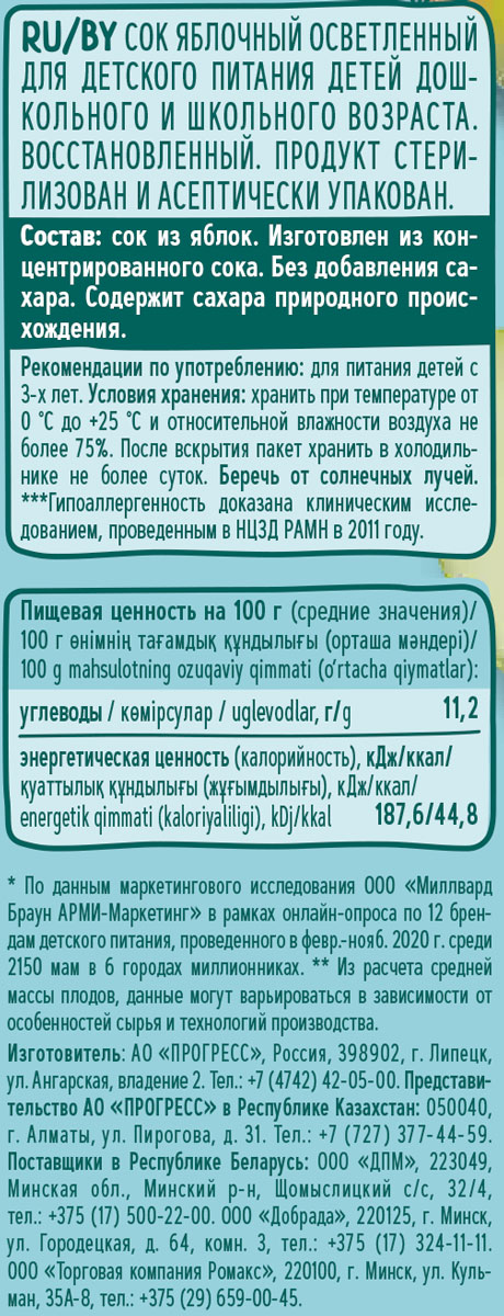 100% натуральный сок из самых вкусных и спелых яблок, в котором бережно сохранены все полезные вещества и витамины. Идеально для первого прикорма, а также для вкусного десерта подросшим малышам. Без добавления сахара. Без консервантов. Без красителей. Удобная упаковка с трубочкой. Легко взять с собой!