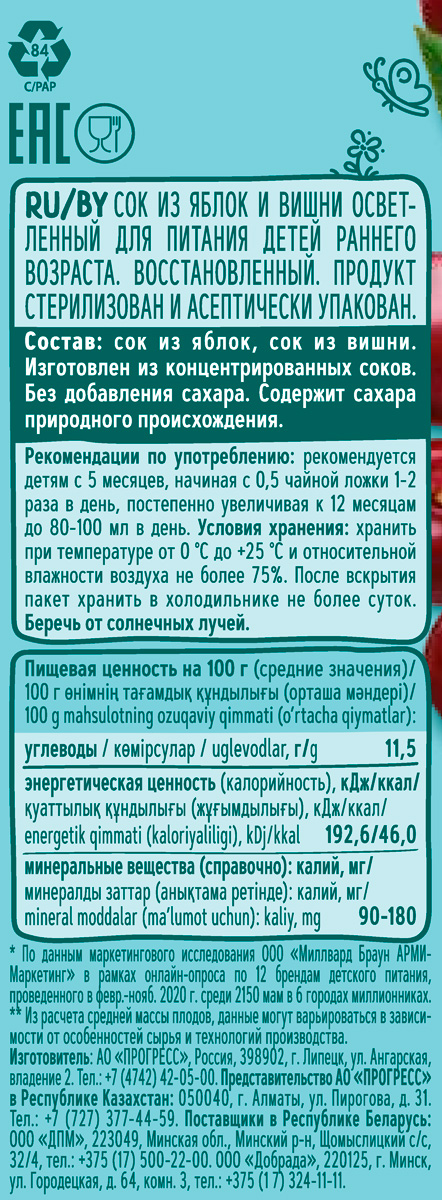 Сок «ФрутоНяня» из яблока и вишни осветленный — отличный способ познакомить малыша старше 5 месяцев с новыми вкусами. В его составе только на 100% натуральные ингредиенты. Яблочно-вишневый сок «ФрутоНяня» — отличный способ разнообразить привычное меню ребенка и зарядить его дополнительной энергией!