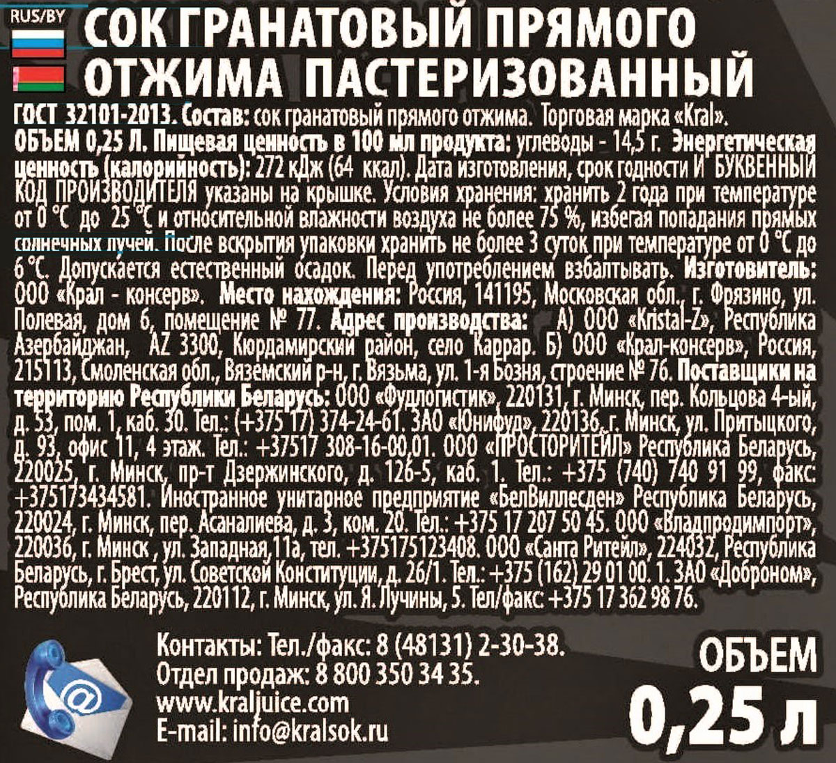 Kral гранатовый сок прямого отжима