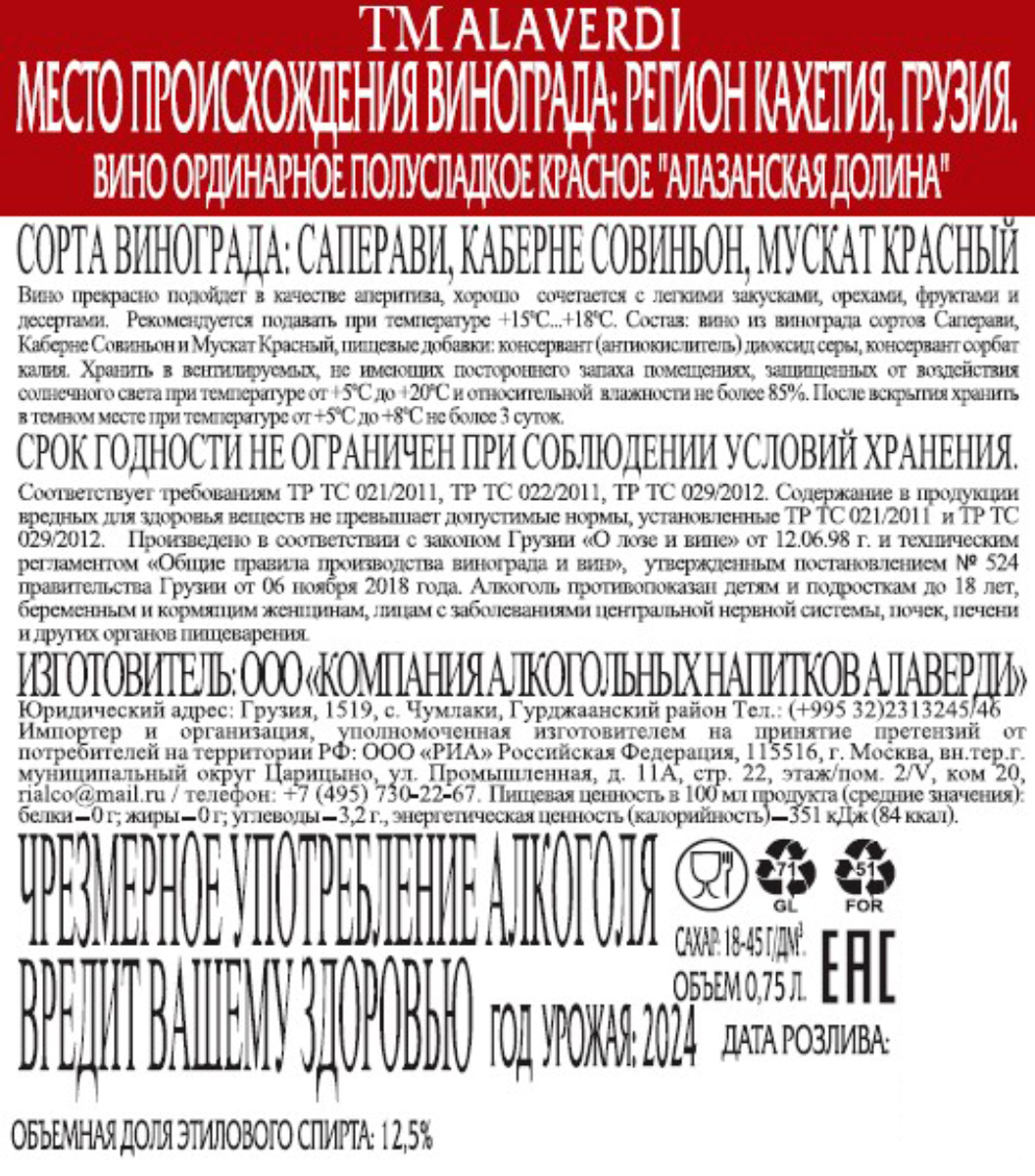 Вино Alaverdi Алазанская Долина ординарное красное полусладкое 0,75 л