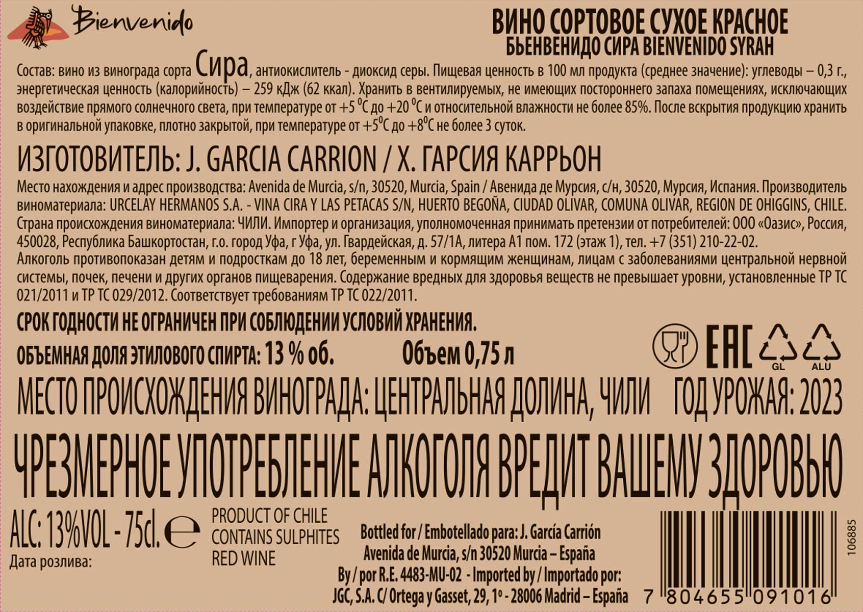 Вино Бьенвенидо Сира красное сухое 0,75 л