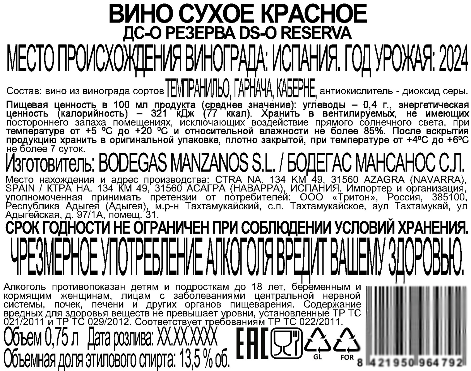 Вино ДС О Резерва красное сухое