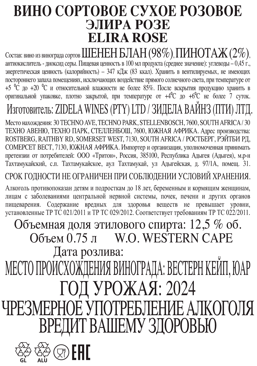 Вино Элира Розе розовое сухое 0,75 л
