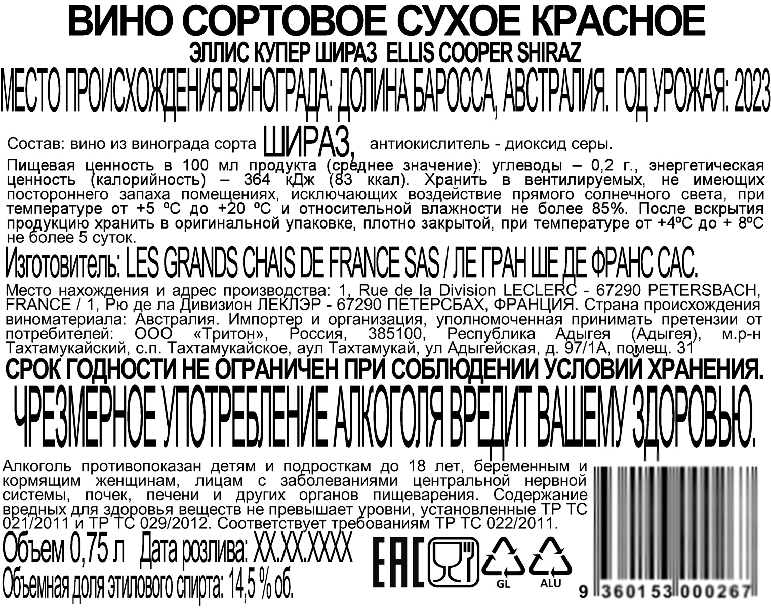 Вино Эллис Купер Шираз красное сухое 0,75 л