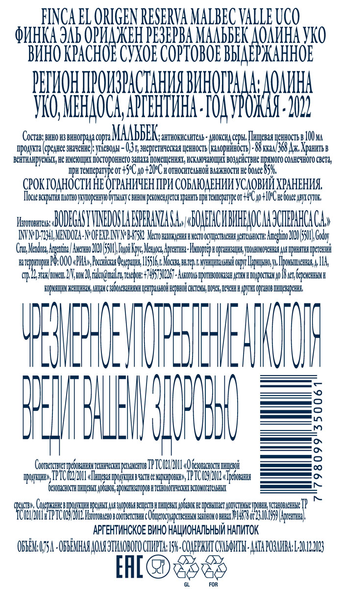 Вино Финка эль Ориджен Резерва Мальбек красное сухое 0,75 л