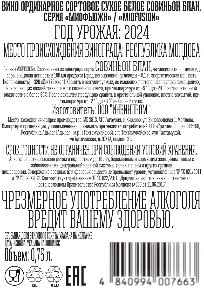 Вино Миофьюжн Совиньон Блан белое сухое
